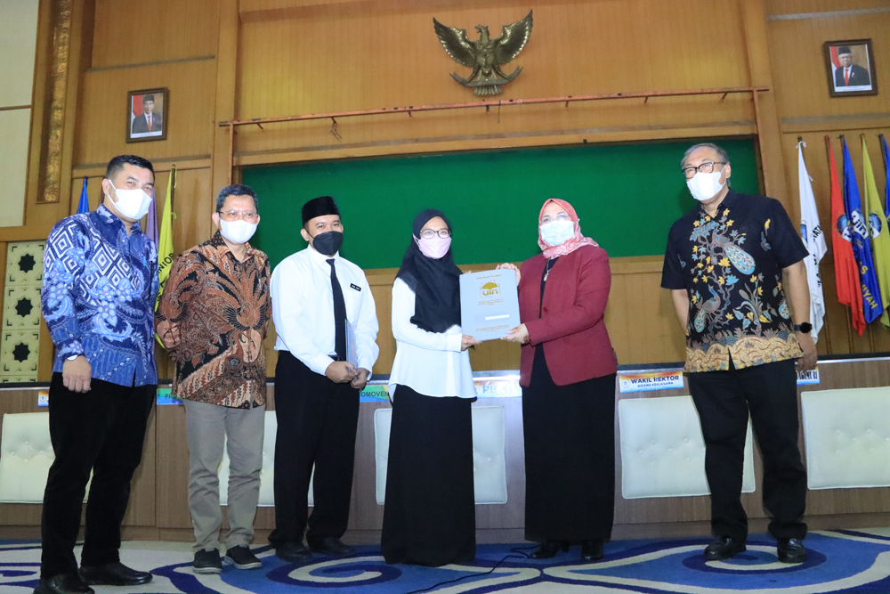 Rektor UIN Syarif Hidayatullah Jakarta Amany Lubis secara simbolis menyerahkan SK CPNS kepada dua CPNS di Gedung Auditorium Harun Nasurion, Jumat (01/04/2022). Hadir dalam acara tersebut, Wakil Rektor Bidang Administrasi Umum Ahmad Rodoni, Wakil Rektor Bidang Kemahasiswaan Arief Subhan, Kepala Biro Administrasi Akademik, Kemahasiswaan, dan Kerja Sama Jaenudin, Kepala Biro Administrasi Umum dan Kepegawaian Juanda Naim, Kepala Biro Perencanaan dan Keuangan Rojikin, para dekan, Kepala Bagian Kepegawaian Azizah, Kepala Bagian Akuntansi dan Pelaporan Muhammad Noor, serta Kepala Bagian Keuangan Ummu Baroat.
